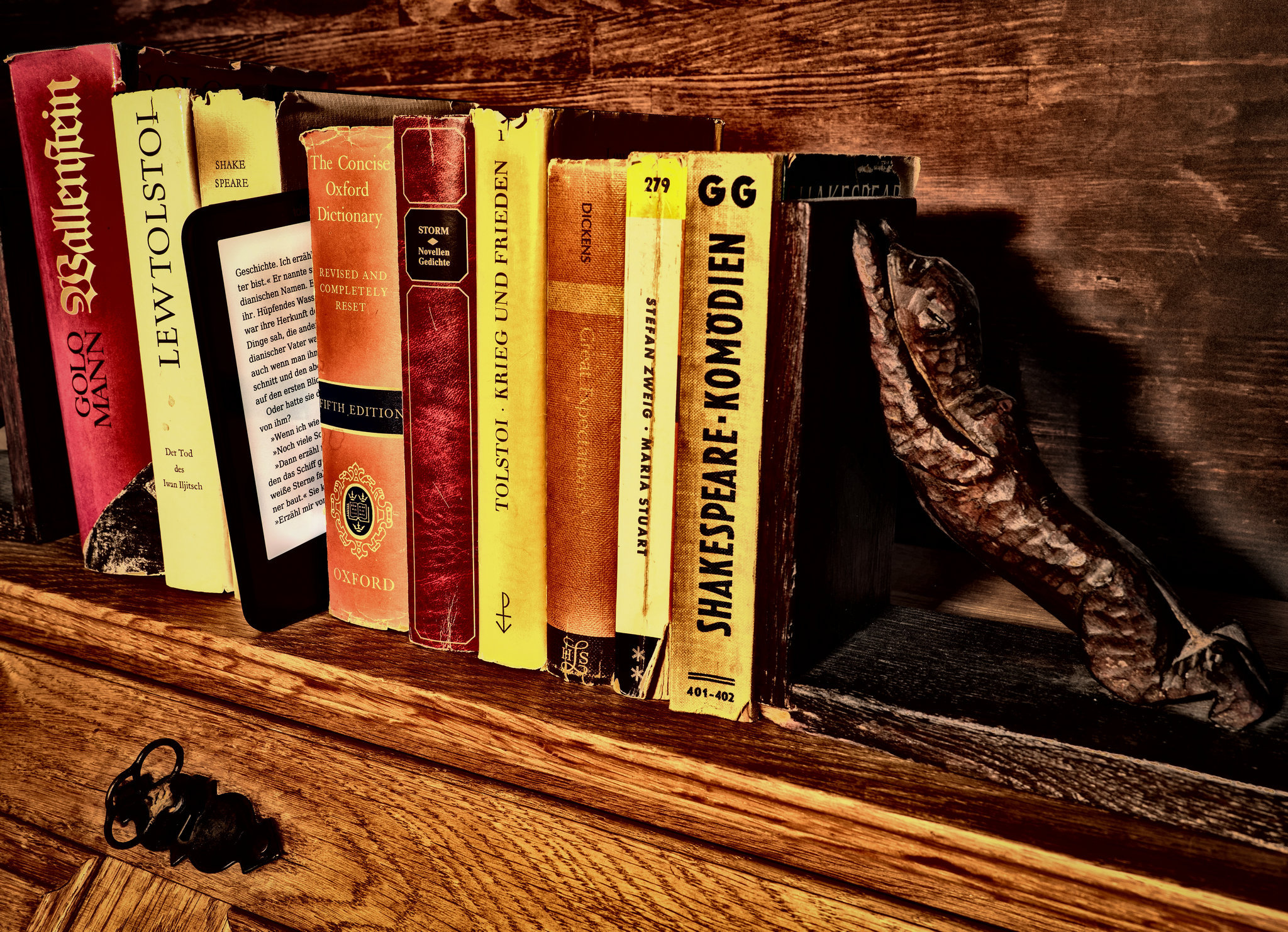 Wilfrieds Stillleben wurde als das Bild mit der stärksten inhaltlichen Aussage gewürdigt. Die Kombination aus alten Büchern und einem E-Reader bringt das Thema „neu neben alt“ auf den Punkt – nicht räumlich, sondern kulturell.