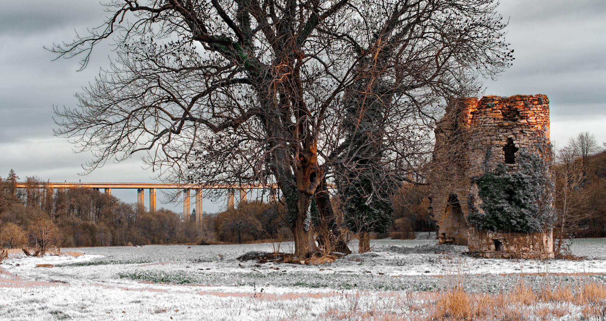 Ingos Aufnahme zeigt die Niederburg bei Büren in einer ruhigen, winterlichen Landschaft, in Kombination mit einer Autobahnbrücke der A44. Ein großer, kahler Baum verstärkt die zeitlose, fast stille Atmosphäre. Das warme Licht auf der Ruine und der Brücke hebt sie subtil hervor.