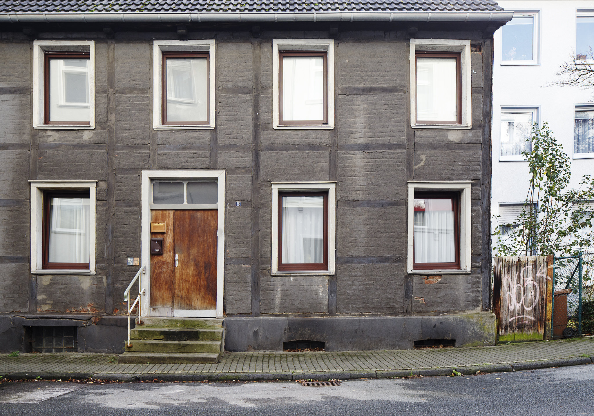 Olivers Aufnahme einer Hausfassade zeigt „neu neben alt“ auf eine differenzierte Weise: Zum einen im direkten Nebeneinander zweier Gebäude, zum anderen innerhalb des alten Hauses selbst, etwa durch modernisierte Fenster und Dachbereiche.