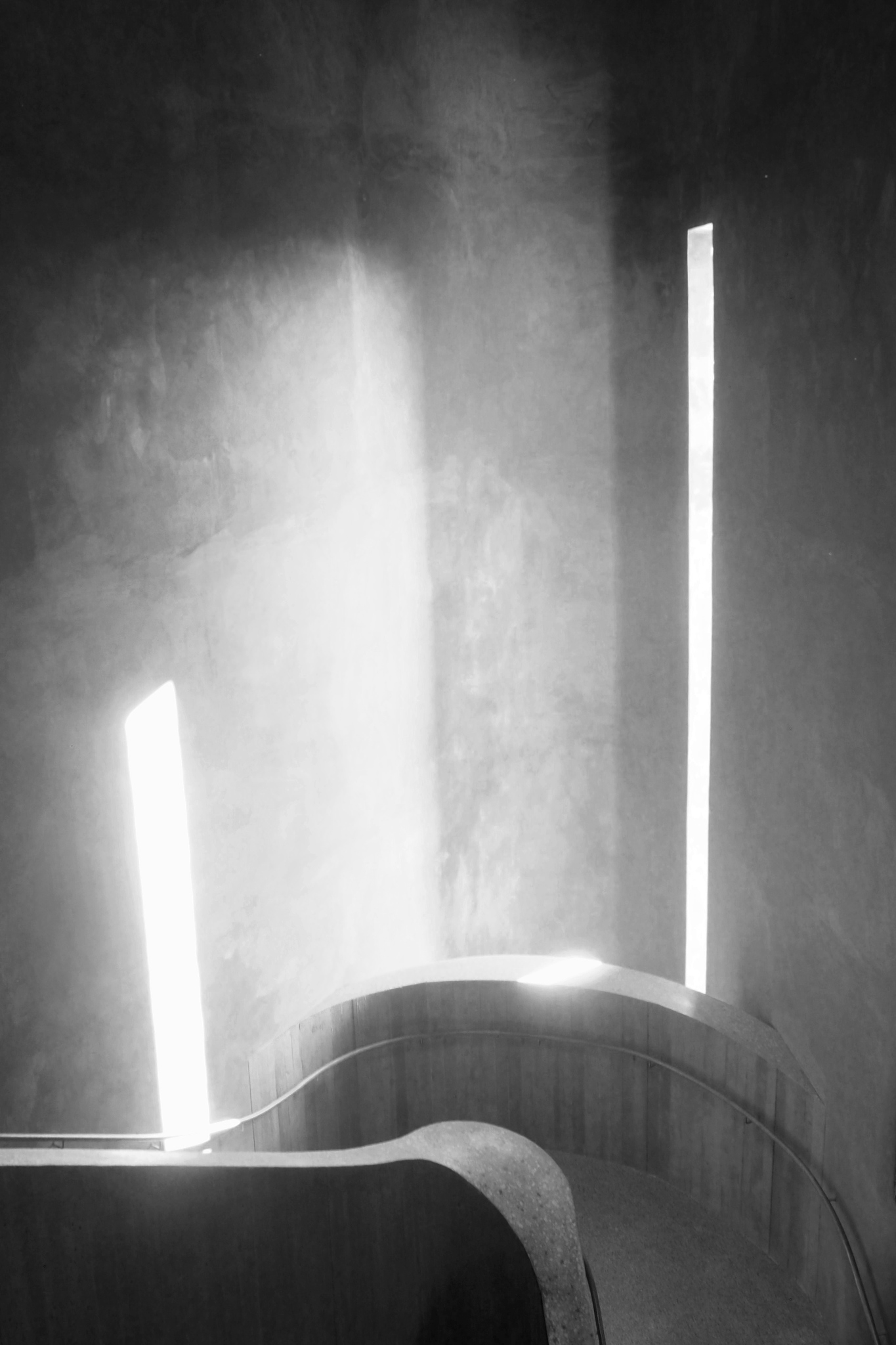 Last but not least, Jörg-Iljas schwarz-weiß-Aufnahme einer Treppe aus der Küppersmühle in Duisburg mit geschwungenem Geländer. Schmale Fenster lassen Licht in geometrischen Formen herein und erzeugen ein interessantes Licht-Schattenspiel.