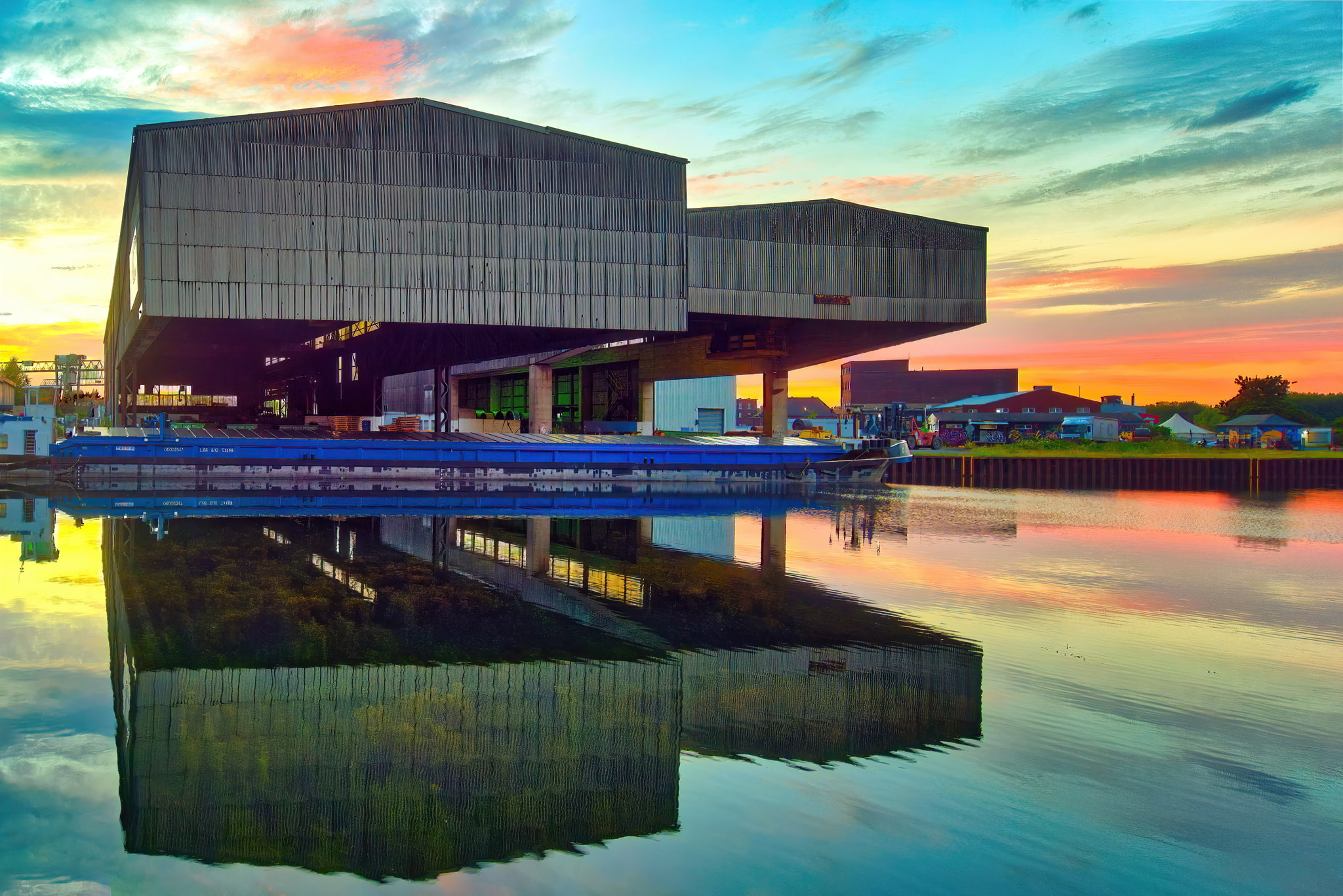 Mit der Abbildung einer Industriehalle im Dortmunder Hafen, das ebenfalls maßgeblich vom Licht, hier allerdings natürlichem, getragen wird, erreichte Rainer den sechsten Platz. Der massive Baukörper wirken beinahe schwebend, getragen von schmalen Stützen. Im ruhigen Wasser spiegelt sich die gesamte Szenerie, wodurch das Bild eine perfekte Symmetrie erhält. Der farbenprächtige Sonnenuntergang verstärkt die dramatische Stimmung – ein Wechselspiel aus Technik und Natur.