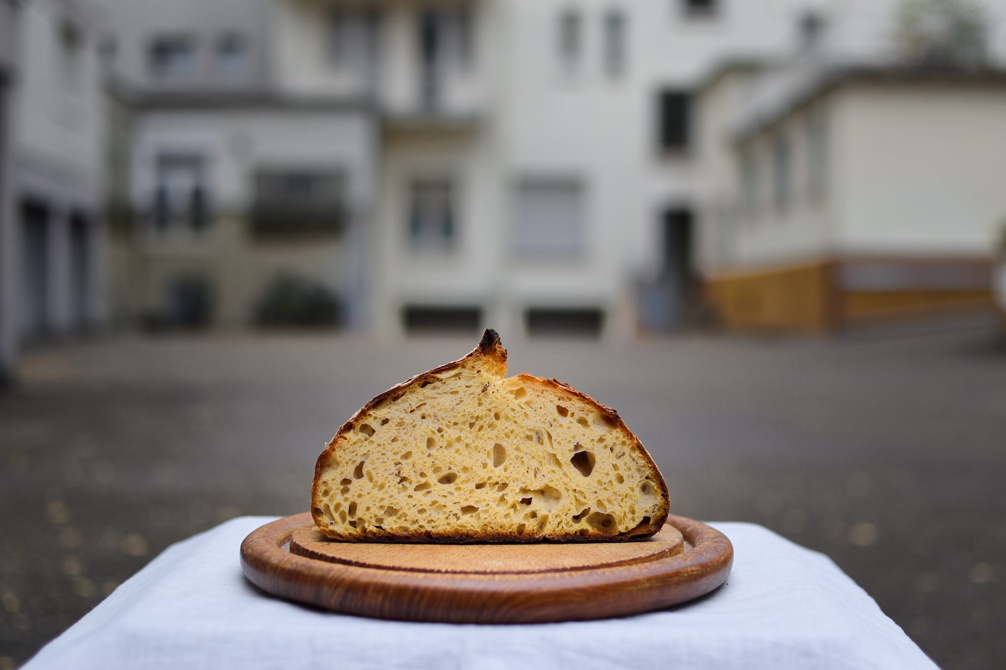 Bennos Beitrag eines halben Laib Brot auf einem Holzbrett vor einer im Hintergrund unscharfen Innenhofszenerie – ein minimalistisches Stillleben, erreichte Platz 8. Dieses Bild fand als Titelbild eines Artikels im Magazin „Back Journal„ Verwendung.