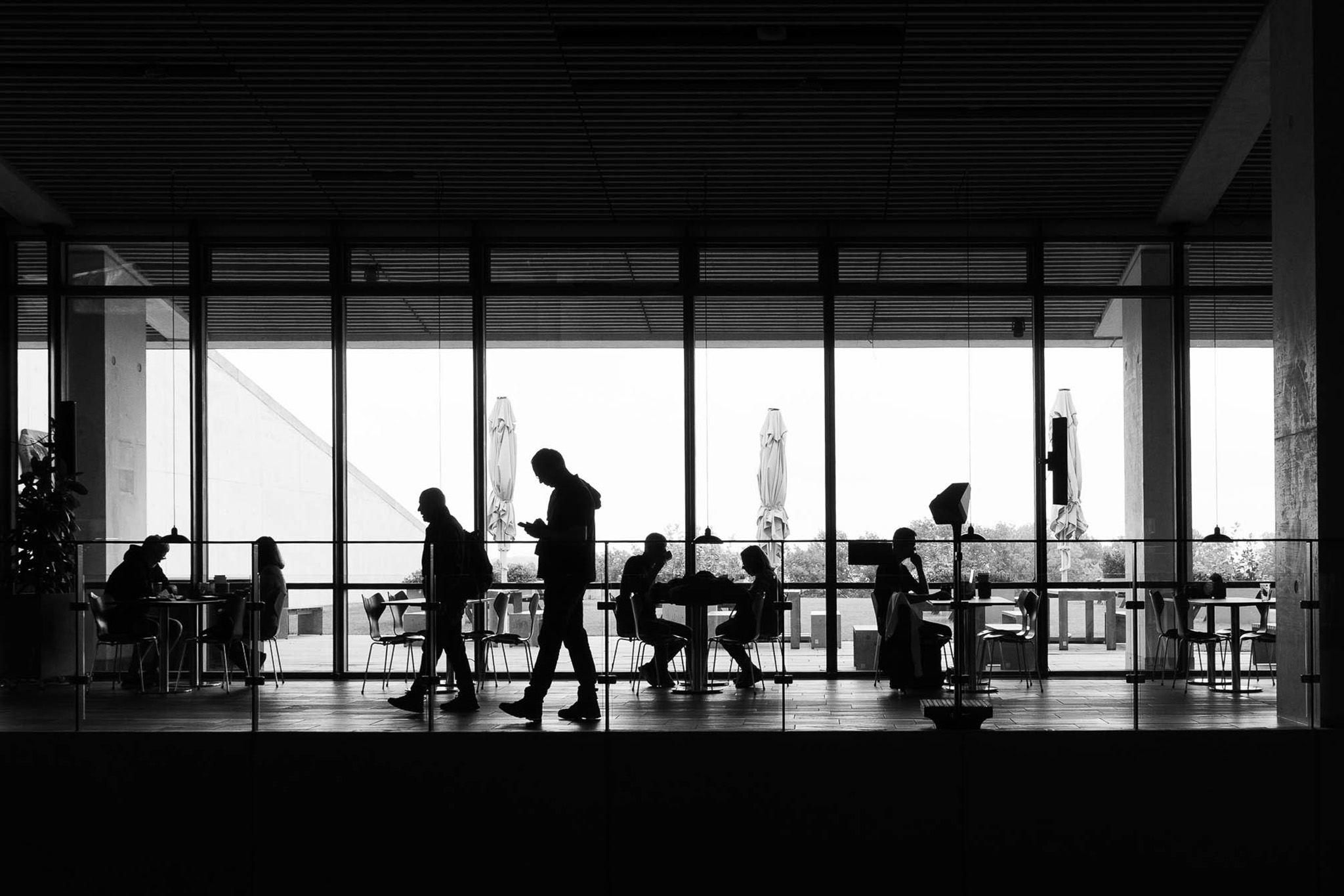 Auf Platz vier landete Dietmar B.s Schwarzweißszene aus einem Café oder Foyer. Die bewusst gesetzten harten Silhouetten im Vordergrund kontrastieren spannend mit dem weichen Licht des Hintergrundes. Die Komposition wirkt durchdacht, auch wenn die großen bildleeren Bereiche oben und unten die Wirkung etwas abschwächen. Dennoch bleibt das Bild ein atmosphärisch starker Moment urbaner Beobachtung.