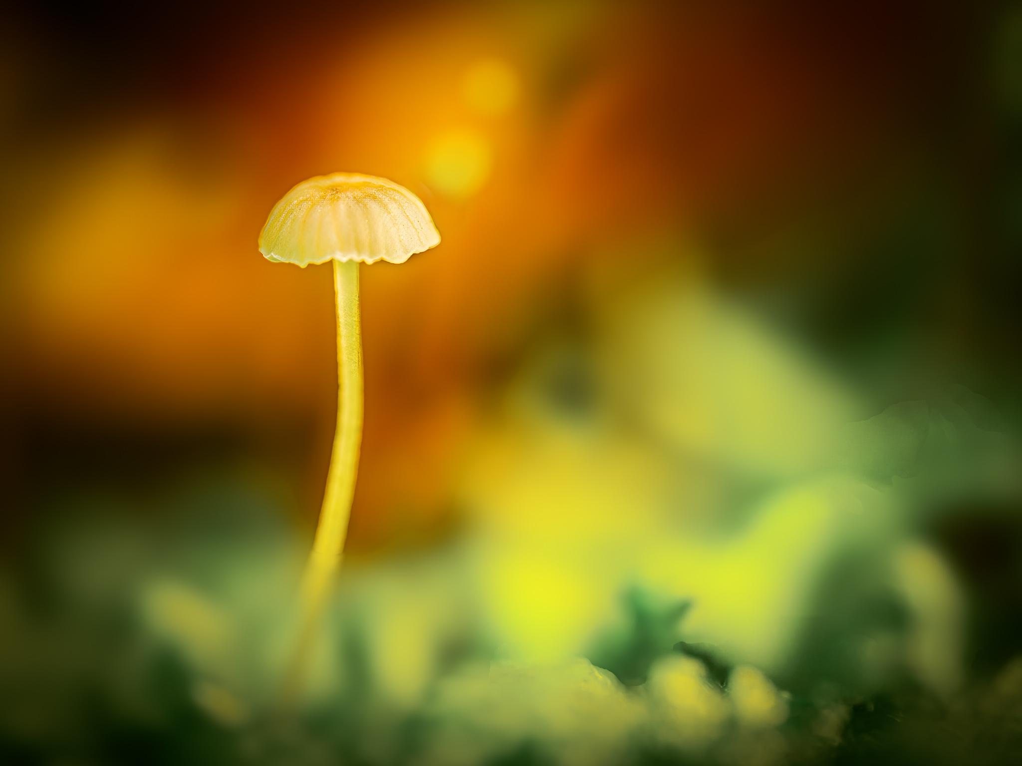 Dittmars Foto auf Platz fünf zeigt einen sehr filigranen, gelblich bis hellorangenen kleinen Helmling. Der Pilz ragt einzeln aus einer grünlich verschwommenen Moosschicht hervor. Der Hintergrund ist weichgezeichnet und in warme Gelb-, Orange- und Grüntöne getaucht. Leider wirkt der Schärfeverlauf am Stiel durch die Bildbearbeitung etwas künstlich.